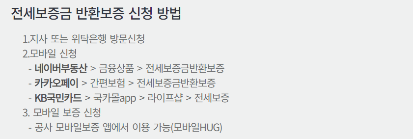전세보증금반환보증 전세보증금 반환보증 신청 방법 1.지사 또는 위탁은행 방문신청2.모바일 신청 - 네이버부동산 > 금융상품 > 전세보증금반환보증 - 카카오페이 > 간편보험 > 전세보증금반환보